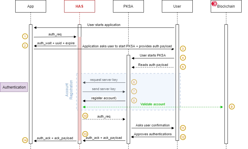 The HAS validates against the blockchain that the account exists and that the PKSA stores a valid private key from the account